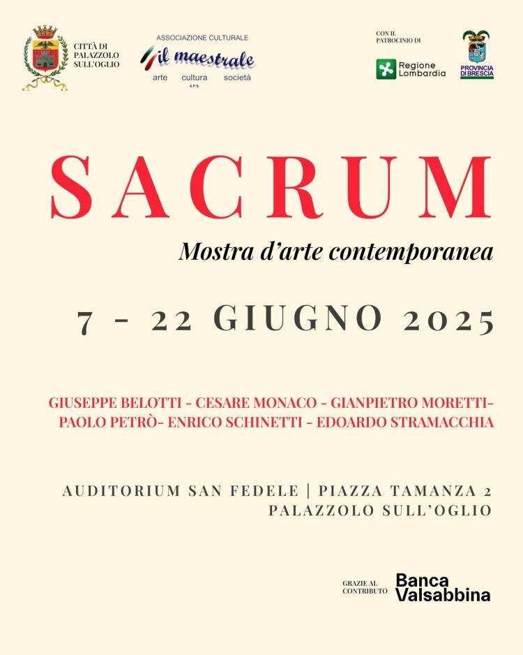 «È con grande piacere che Palazzolo sull’Oglio accoglie, nei suggestivi ed evocativi spazi dell’Auditorium San Fedele, la mostra Sacrum: un evento espositivo di grande intensità che invita ciascuno di noi a riflettere su un tema tanto antico quanto attuale: il sacro – commentano il Sindaco di Palazzolo sull'Oglio, Gianmarco Cossandi e l’Assessore alla Progettazione Culturale Marina Bertoli –. Le opere esposte parlano al cuore prima ancora che alla mente, richiamando simboli e memorie della storia dell’arte sacra, ma anche attingendo a linguaggi più laici. In ogni gesto artistico emerge l’impegno, profondo e autentico, di rendere attuale ciò che, da duemila anni, continua a interrogare l’animo umano. Ringraziamo le Associazioni il Maestrale e Artisti Bresciani e tutti gli artisti coinvolti. In un tempo in cui il sacro, nella sua più ampia accezione, sembra spesso relegato ai margini, Sacrum ci ricorda che l’arte può ancora essere voce viva di una spiritualità che si rinnova e che continua a cercare senso, bellezza e comunità».