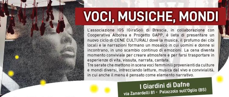L’associazione IGS IGiraSoli di Brescia, in collaborazione con Cooperativa Alborea e Progetto GAPP, è lieta di presentare un nuovo ciclo di CENE CULTURALI dove la musica, il profumo dei cibi locali e le narrazioni formano un mosaico in cui uomini e donne si incontrano, in uno scambio continuo di emozioni.